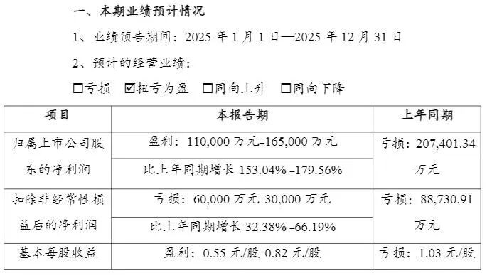 数据显示,公司预计2025年归属上市公司股东的净利润为11.00亿元至16.50亿元,上年同期为亏损20.74亿元;预计2025年扣除非经常性损益后的净利润为亏损3.00亿元至6.00亿元,上年同期为亏损8.87亿元。